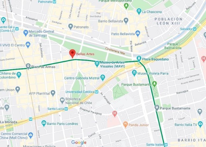 Apesar deste cantinho do centro estar mais próximo da linha verde do metrô (já que indicamos a estação bellas Artes), a linha vermelha, que é a principal da cidade, também está muito próxima, com as estações Universidad Catolica e Santa Lucia (a baldeação entre as duas linhas acontece na Baquedano, mais em direção a Providencia) a algumas quadras. Das 3 opções de localizações que apresentamos, esta é a que tem valores mais acessíveis.